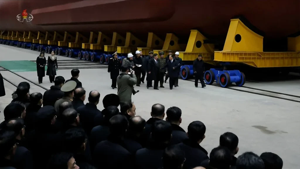 En compagnie de sa fille Ju Ae, le dirigeant nord-coréen Kim Jong Un a visité le chantier d’un sous-marin nucléaire de 8 700 tonnes capable de lancer des missiles sol-air, sur cette photo diffusée par l’agence de presse officielle nord-coréenne KCNA le 25 décembre 2025.